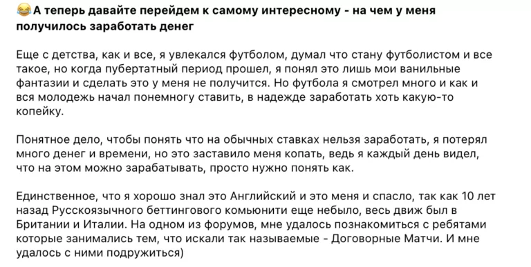 Сам автор проекта рассказывает, что много лет увлекается беттингом, а создание Телеграм-канала стало для него не только способом монетизации, но и возможностью вести блог на интересующую его тему.