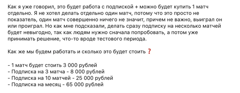 - Стоимость. Цена 3 000 ₽ за матч кажется завышенной, но это стандартная ситуация для проектов, предлагающих детальный анализ.