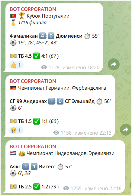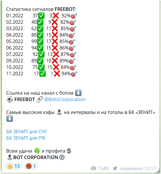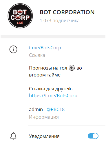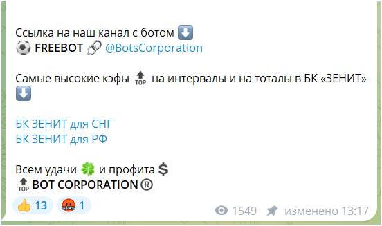 Bot Corporation — это Телеграм-канал, которым управляет каппер Rbc18, специализирующийся на ставках на футбол и хоккей. В этом проекте предлагается заключать пари с помощью бота, а также обещается высокая проходимость и прибыльные ставки на тоталы и интервалы в букмекерской конторе ЗЕНИТ. Давайте подробнее разберемся, можно ли доверять этому каналу и не является ли он частью мошеннической схемы.