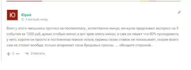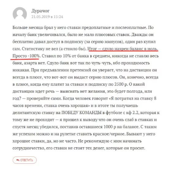 Предложение кажется привлекательным, но при коэффициентах 2.00–2.50 такие цены выглядят завышенными. Если оплачивать хотя бы один прогноз в день, месячная стоимость услуг составит 30 000 рублей. Чтобы окупить такие затраты и получить прибыль, потребуется банк в 250–300 тысяч рублей как минимум!