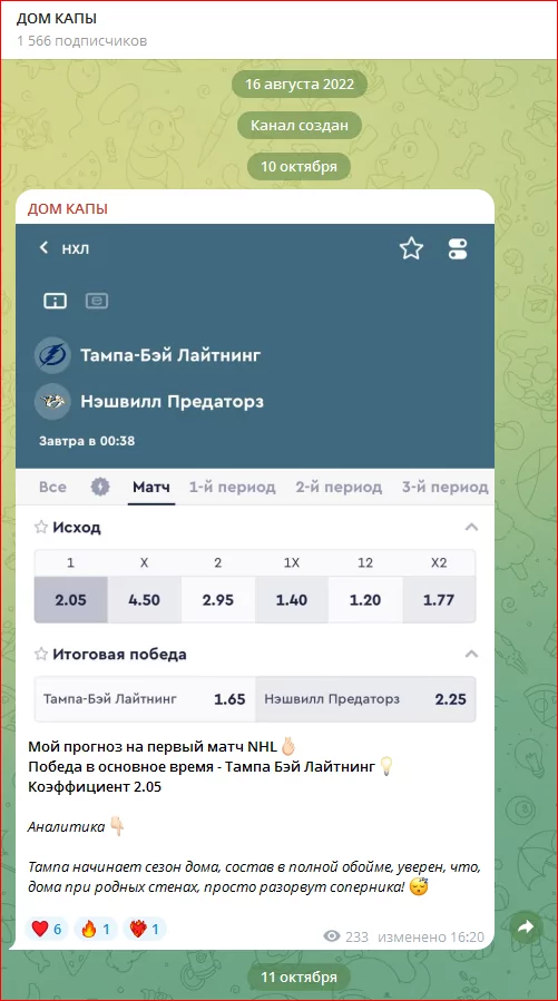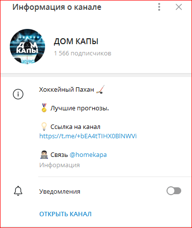 Дом Капы — это Телеграм-канал, в котором каппер @hockeykapa публикует прогнозы на хоккейные матчи, в основном, по КХЛ. Канал предлагает как ординары, так и экспресс-ставки. Ранее связь с подписчиками осуществлялась через ЛС Home Kapa, но сейчас контактная информация изменилась. Мы решили разобраться, насколько стоит доверять этому проекту и что думают реальные пользователи о его услугах.