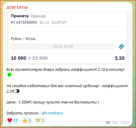 Мы не рекомендуем подписываться на канал Дом Капы. Прогнозы этого каппера не обеспечат стабильного дохода, так как он не предоставляет достаточных доказательств своей эффективности, а также не делится аналитикой и стратегиями ставок. Риски вложений в такие ставки высоки, и вряд ли этот проект стоит вашего внимания.