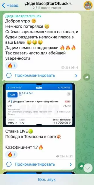 Сам канал насчитывает около 2,5 тысяч подписчиков, однако их активность крайне низкая, что наводит на мысль о накрутке аудитории. Формат подачи информации типичен для большинства капперов: минимум анализа, сухие прогнозы и обещания высокой проходимости ставок.