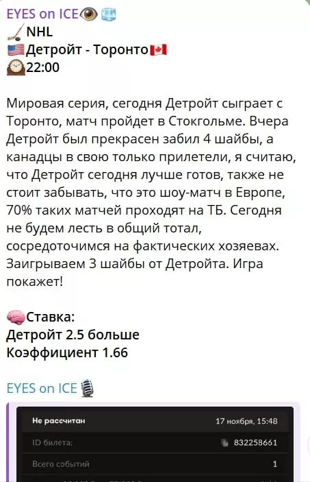 Проект EYES on ICE — это Telegram-канал, созданный каппером Александром (@alexock), который на старте сообщает, что хоккей — это его страсть, и он готов вложить в прогнозы весь свой опыт. Он ориентируется на НХЛ и АХЛ, и предлагает своим подписчикам аналитику для ставок на эти лиги. Оценим, что предлагает этот проект и насколько он надежен для тех, кто хочет заработать.
