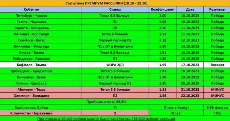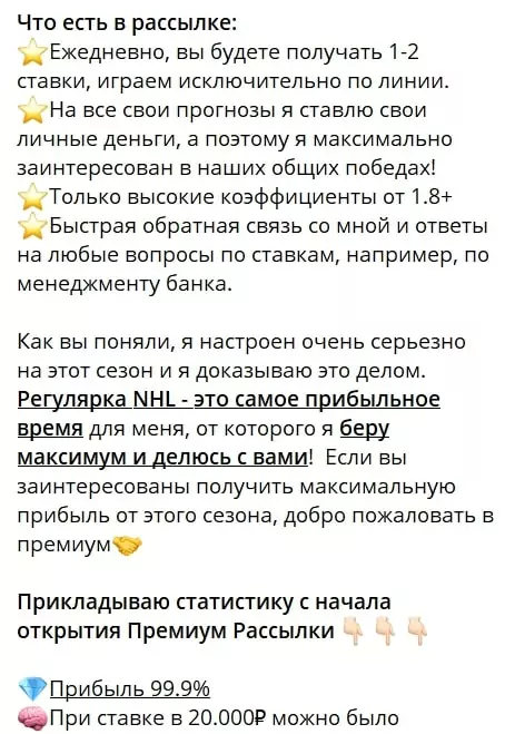 Одним из главных предложений является Премиум-рассылка, которая ориентирована на прогнозы по матчам НХЛ и АХЛ. Подписчики получают 1-2 ставки в день с коэффициентами от 1.8 и выше, а также помощь в управлении банком. Однако стоит отметить, что на основании опубликованной статистики, каппер ставит флетом 10%, что выше рекомендованного для профессионалов уровня в 5%.