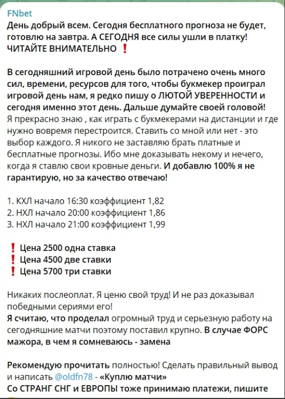 Деятельность Telegram-канала FNbet в сфере ставок на спорт