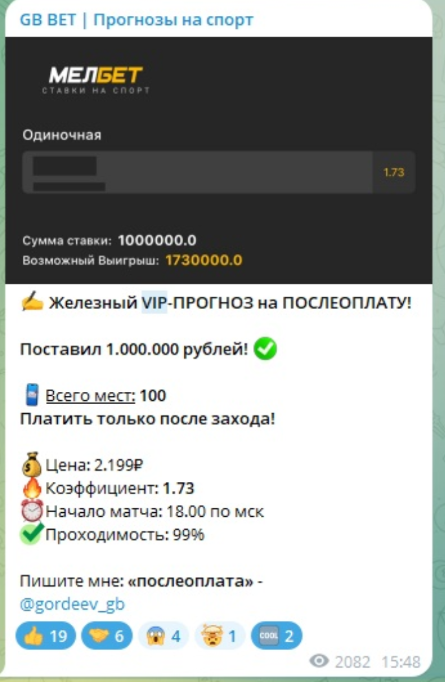 Платные прогнозы стоят 2 199 рублей и доступны по системе послеоплаты. Подписок или VIP-чата нет. Схема проста: подписчик обращается к администратору, получает прогноз, а после выигрыша оплачивает услугу.