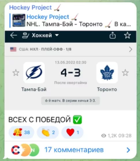 Hockey Project – один из таких Телеграмм-каналов, который якобы работает на благо своих подписчиков, но на самом деле зарабатывает на случайных прогнозах.