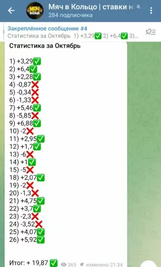 Автор не использует сторонние сервисы для верификации своей статистики, а сам публикует результаты. Однако последние данные были обновлены еще в октябре, хотя на дворе уже январь. Это может говорить о том, что недавние прогнозы скорее всего неудачные — например, пять последних прогнозов оказались убыточными. Обычно предлагаемые коэффициенты колеблются в пределах 1.8. В одном из отчетов за успешный месяц упоминается прибыль в 19 флетов, но не уточняется, касаются ли эти результаты платных или бесплатных прогнозов.