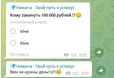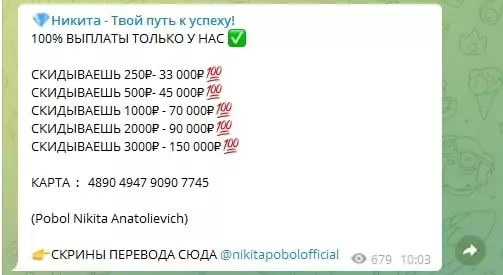 Вывод: Telegram-канал «Никита Твой путь к успеху» – это мошеннический проект, созданный для выманивания денег у доверчивых пользователей. Любые предложения сотрудничества с администратором стоит игнорировать, чтобы не потерять свои средства.