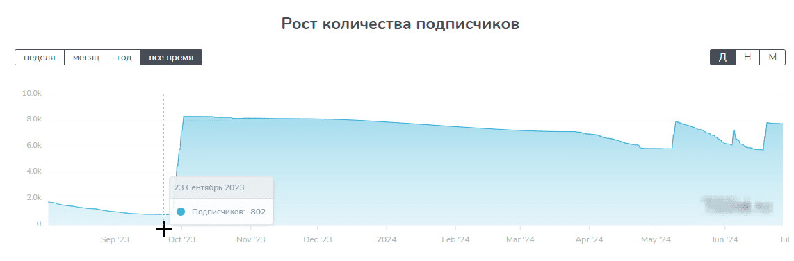 Анализ динамики подписок показал аномальные скачки. В сентябре 2023 года всего за один день на канал подписалось более 6 тысяч пользователей. Однако средний охват постов соответствует уровню канала с 2–3 тысячами подписчиков, что говорит о наличии ботов, не взаимодействующих с контентом.
