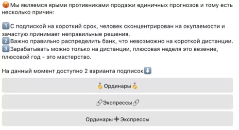 | Формат ставок | Коэффициент | Прогнозов в день | Проходимость | Цена (₽/месяц) | Цена (₽/год) |