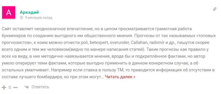 Отзывы на сайте может оставить любой зарегистрированный пользователь. Чаще всего хвалят конкурсы с призами и бесплатные прогнозы, полезные как новичкам, так и опытным игрокам. На форумах негатив встречается редко — в основном пользователи отмечают информативность и открытость сайта. Однако некоторые жалуются на неудачные прогнозы, приводящие к убыткам.