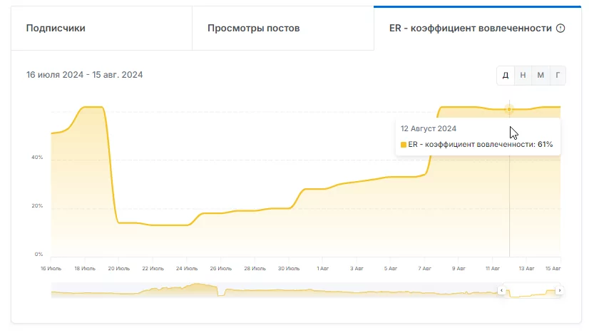 Признаков накрутки подписчиков нет. Около 61% пользователей активно следят за публикациями, что свидетельствует о живой аудитории.
